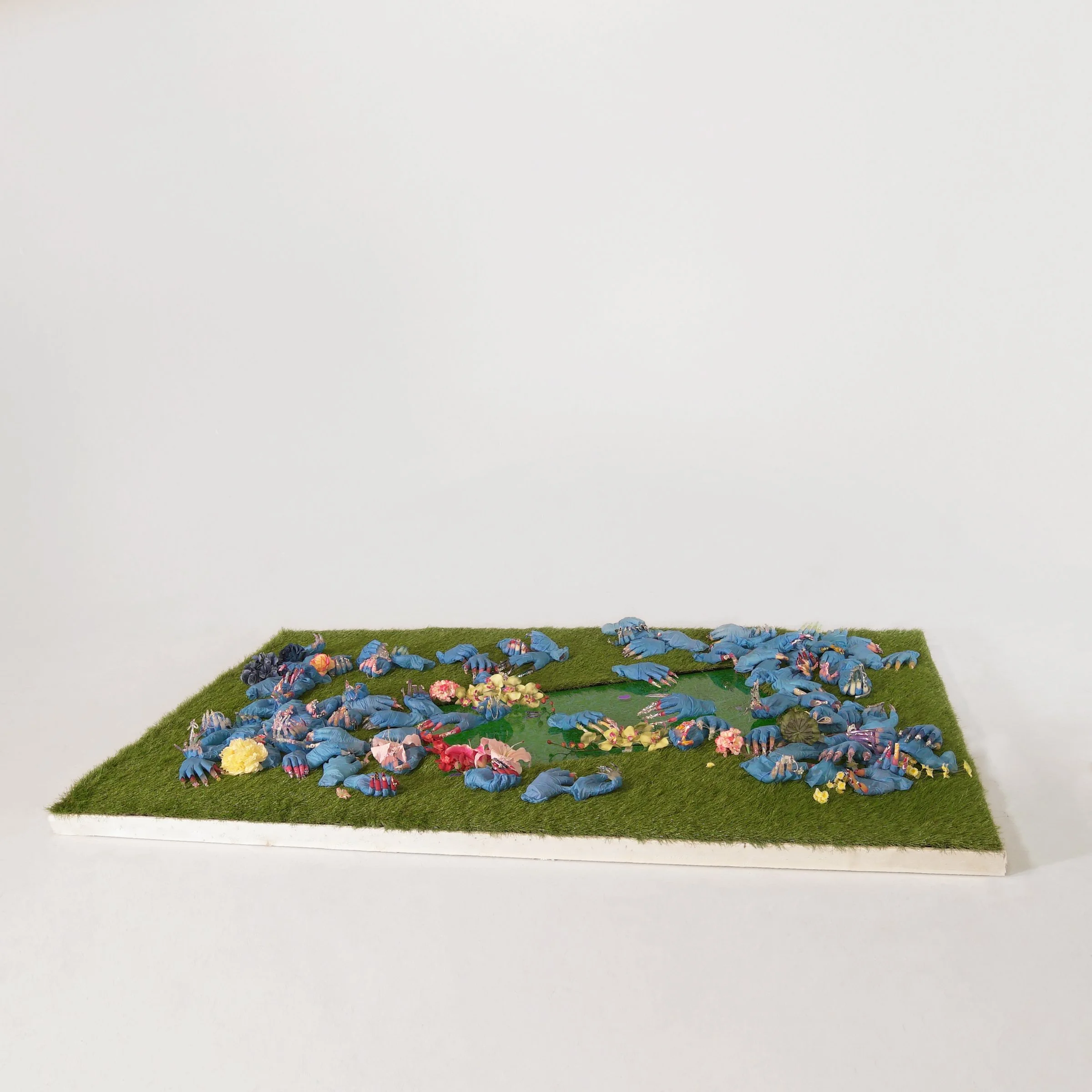 Nursery is a mixed-media installation comprising sculptures of gloved hands with fancy nails, interspersed with grass and electronic screens. These hands, adorned with exaggerated and gorgeous manicures, emerge from the glove fingertips, symbolizing tools of digital production. They are tools for digital production that touch the electronic screen. They produce data and consume data as well. This project delves into the complexities of female labor and the digital illusions perpetuated by inexpensive internet labor.